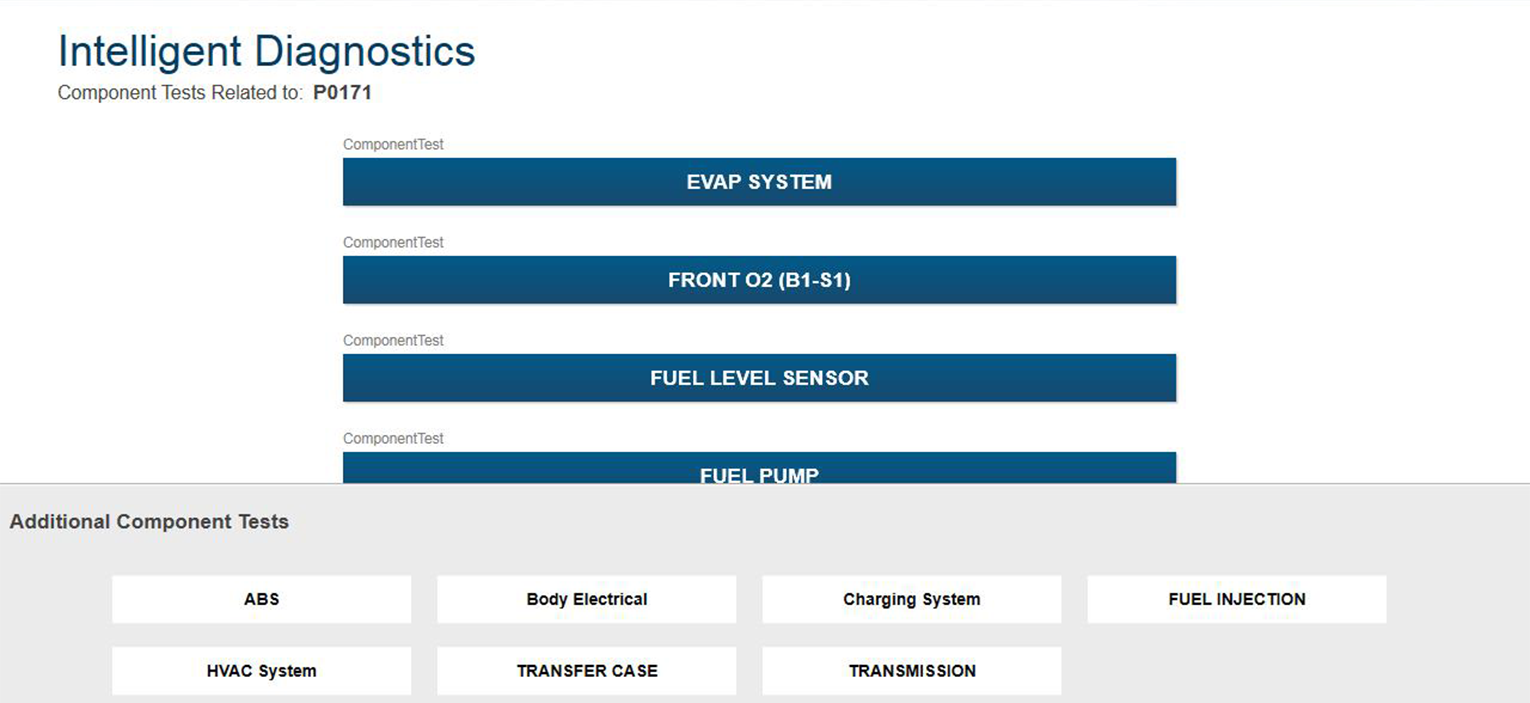 Additional Component Tests may be displayed at the bottom of the screen depending on the vehicle. These options are not DTC related, but are vehicle specific related, and may be useful in troubleshooting or validating repairs.