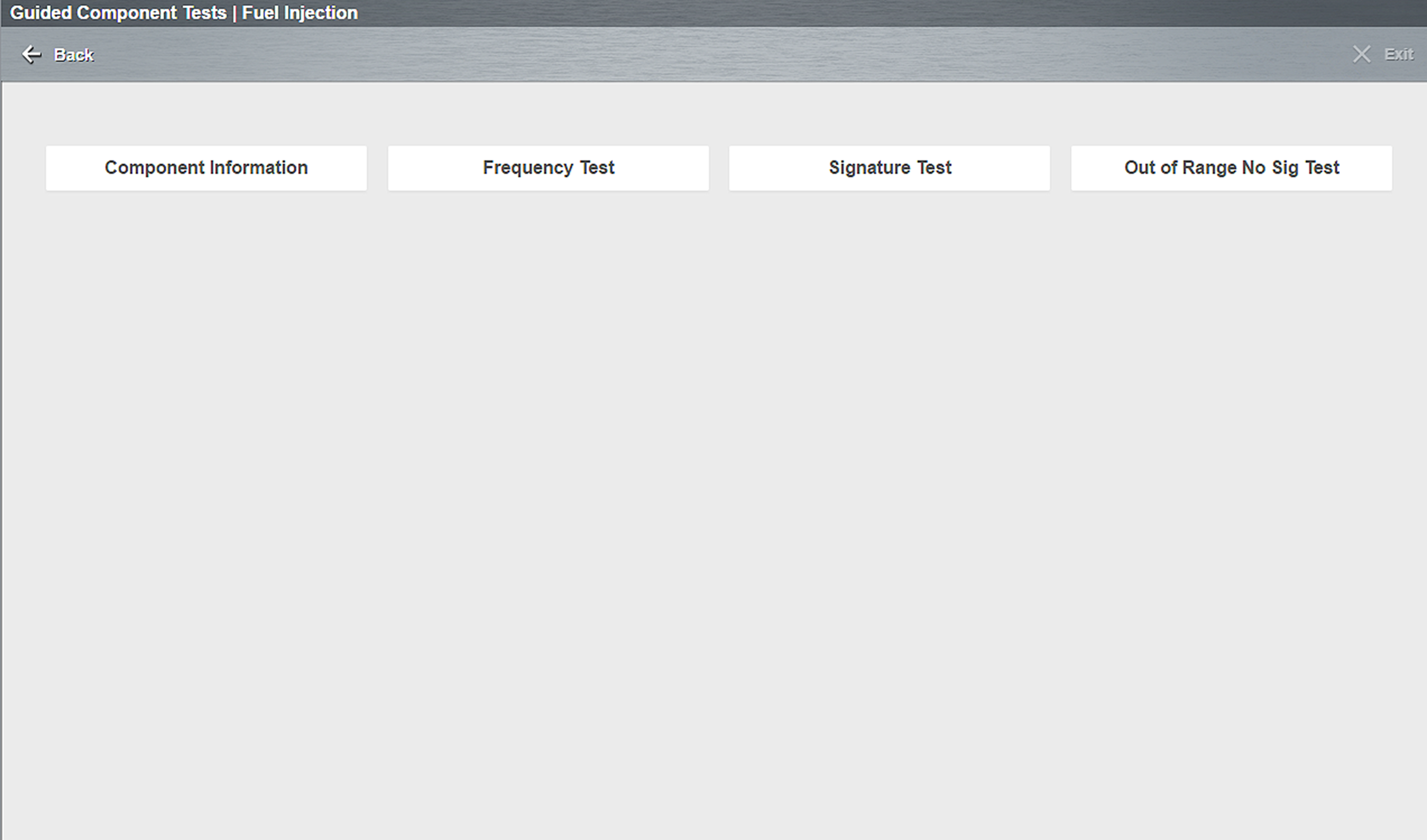 Selecting the Guided Component Tests card opens the Components Tests main menu , which displays a menu list of tests related to the troubleshooting of the selected codes.