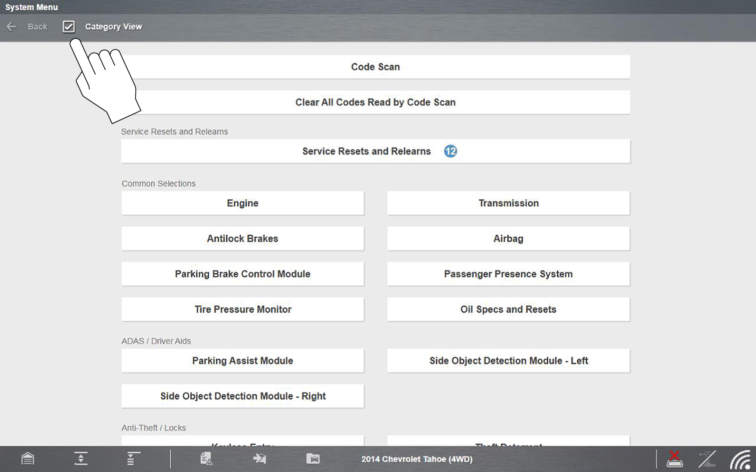 The System menu can be displayed in two views, by individual system categories or by common vehicle system categories. To change the view, select/deselect the Category View checkbox in the upper toolbar. Typical views are shown below.