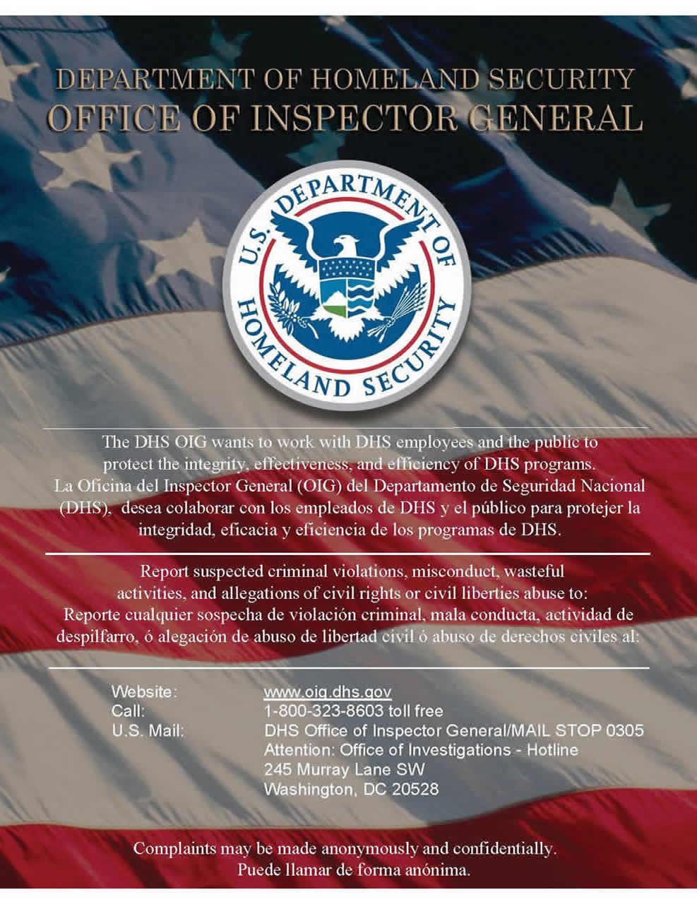 Concerns or issues may be made in a confidential and anonymous manner. The Company's Code of Business Conduct and Ethics prohibits any person from retaliating against an employee for any report made in good faith. The Department of Homeland Security/OIG Hotline is designed to receive allegations regarding: