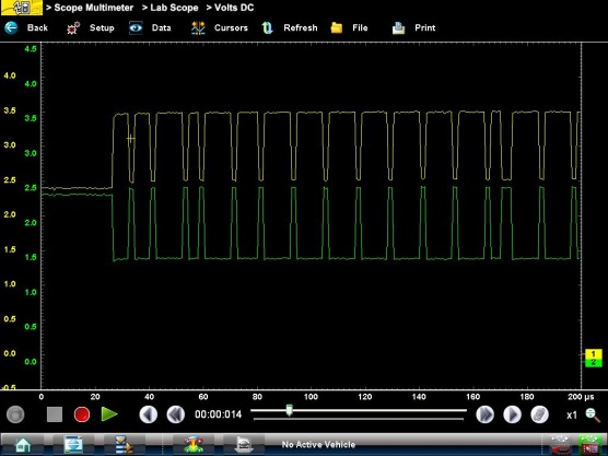 The waveform below shows both the signal when CAN High and CAN Low are tested with respect to ground and the differential voltage between CAN High and Can Low. Example shown from a Volvo XC-90.