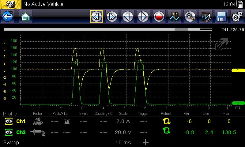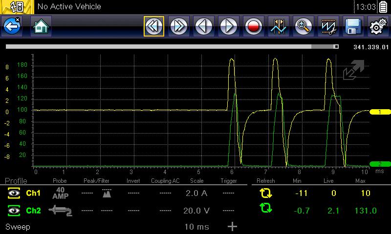The cylinder 1 and cylinder 2 injectors were tested to compare a functioning cylinder and the faulty cylinder. The difference in current flow on both cylinders is evident, but it should be noted that the voltage in both traces is similar.
