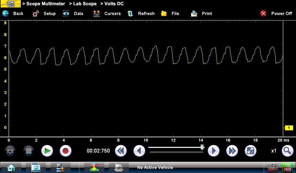 Another example is testing a fuel pump. Below are two waveforms from a 1.6L petrol Ford Focus fuel pump. The first image is pre-repair and the second is post-repair. It is again clear from both that the fuel pump motor is faulty and once it was replaced, the vehicle operated as expected.