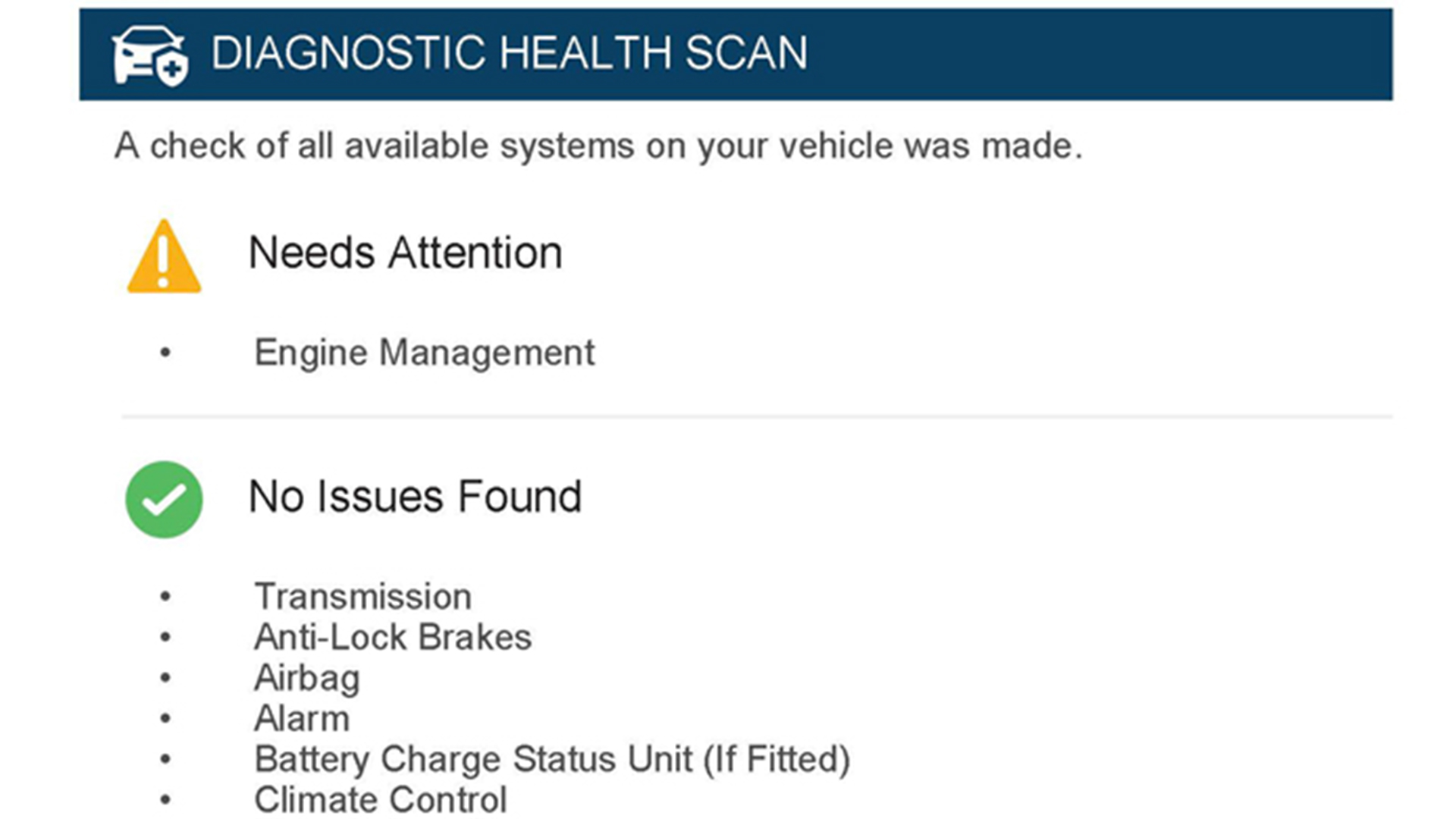Running a Health Scan provides assurance to a vehicle owner of the vehicle’s state before and after repairs. Since numerous vehicle systems may not display issues through warning lights or by displaying a message on the Diagnostic Information Center of the vehicle, the Health Scan becomes essential in detecting hidden problems.