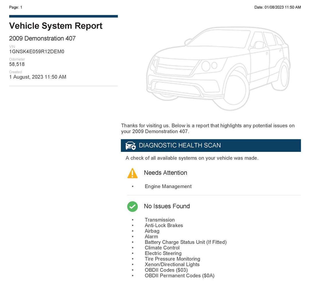 By presenting customers with the health-scan report, technicians can show customers existing issues, and once the vehicle is repaired, can demonstrate the effectiveness of the repairs. Additionally, copies of these reports can be shared with customers for their personal records and with insurance companies as supporting documentation.