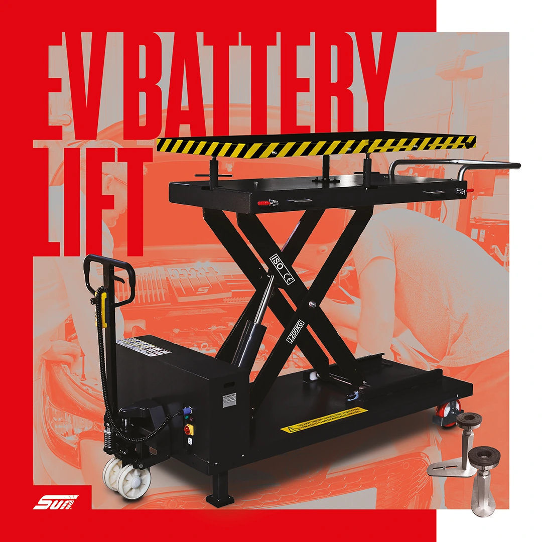 Now is the time to future-proof your workshop with the SUN EV and HEV battery lift. This new lift from SUN is an electro-hydraulic equipment with dual speeds that allows you to mount and remove batteries from electric and hybrid vehicles. It has a lifting capability of 1200 kg and a lifting range of 800mm to 1810mm, making it suitable for EV, BEV, HEV, and PHEV service shops and dealerships.