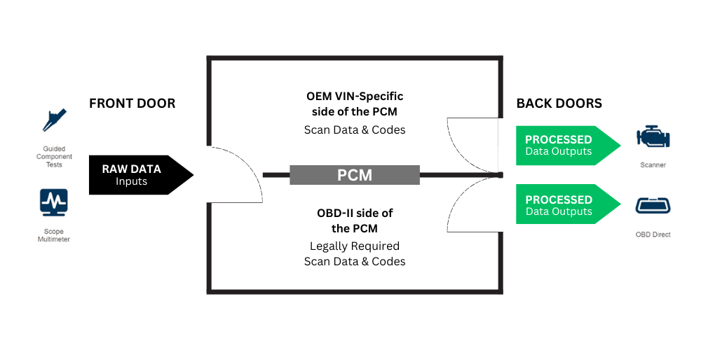 - The Back Doors: Processed data and codes exit through two separate back doors—one for OEM data and the other for OBD-II data.