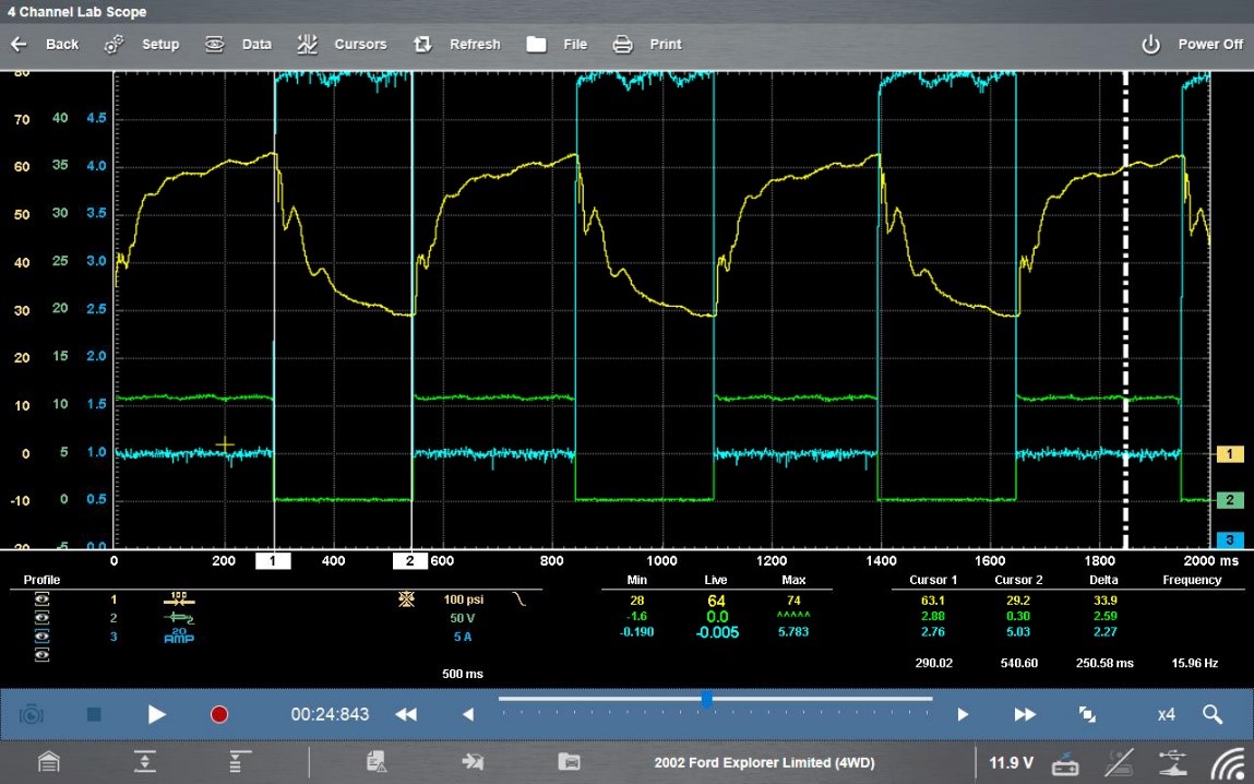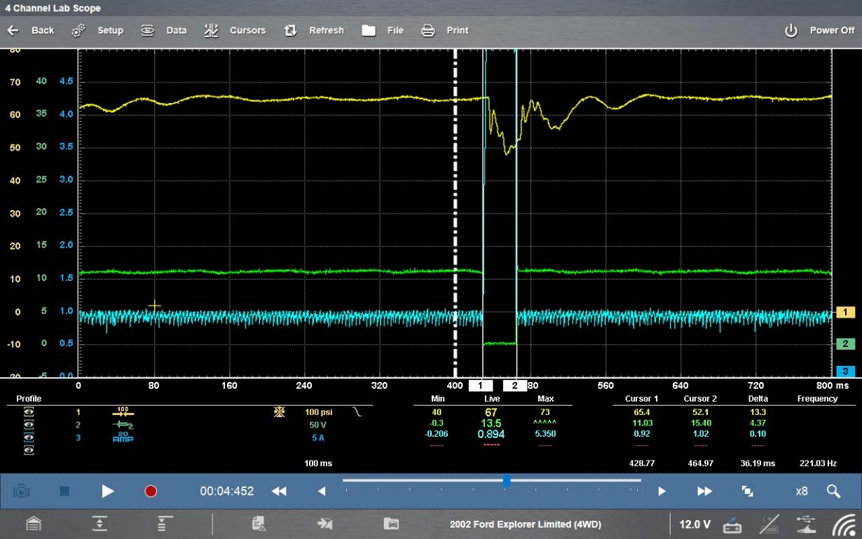 It’s time to investigate a little further by hooking up to an injector and checking both the injector and the fuel pressure at the same. In this example, we have the pressure on the yellow channel (channel one), the green channel is the fuel injector (power voltage), and then the blue channel is the AMP probe, to make sure that fuel injector is opening.