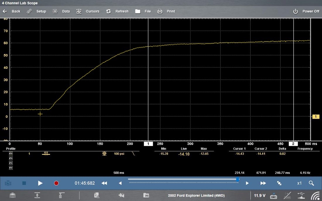 The sensor was replaced and the same test was repeated to verify that same pattern was no longer happening. The same process was followed to hook up the channels and we can see that the pressure stays around 60psi and then it drops down to 50psi and then builds its way back up. We can see where the injector closes and the pressure builds until we see the next injector firing event happens. And, the ‘on time’ is back down to approximately 36 milliseconds – a much more reasonable ‘on time’.