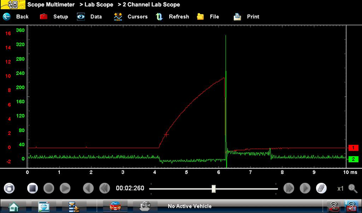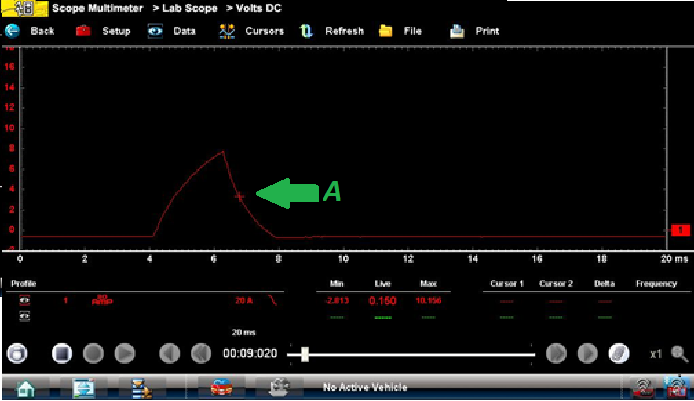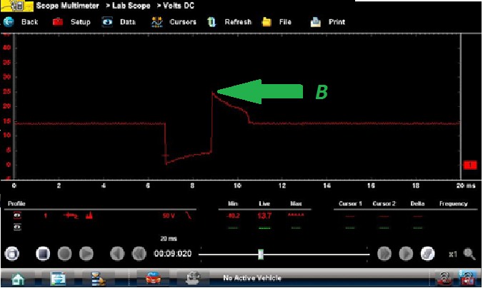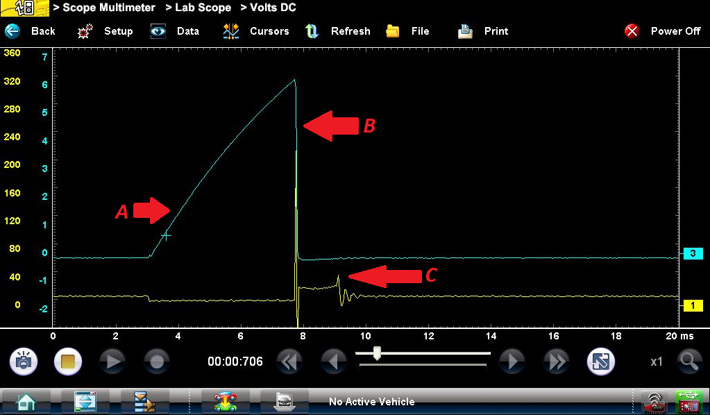 The image below shows the same vehicle after the faulty ignition coil was replaced. Point (A) shows the correct current ramp-up trace for a functioning primary winding. At point (B) it can be clearly observed that correct secondary circuit operation is evident and at point (C) a larger induced voltage is displayed.*