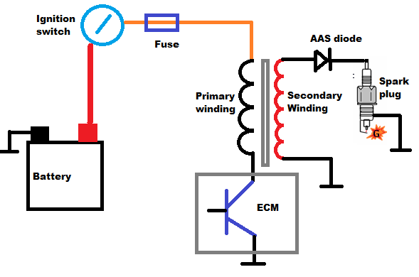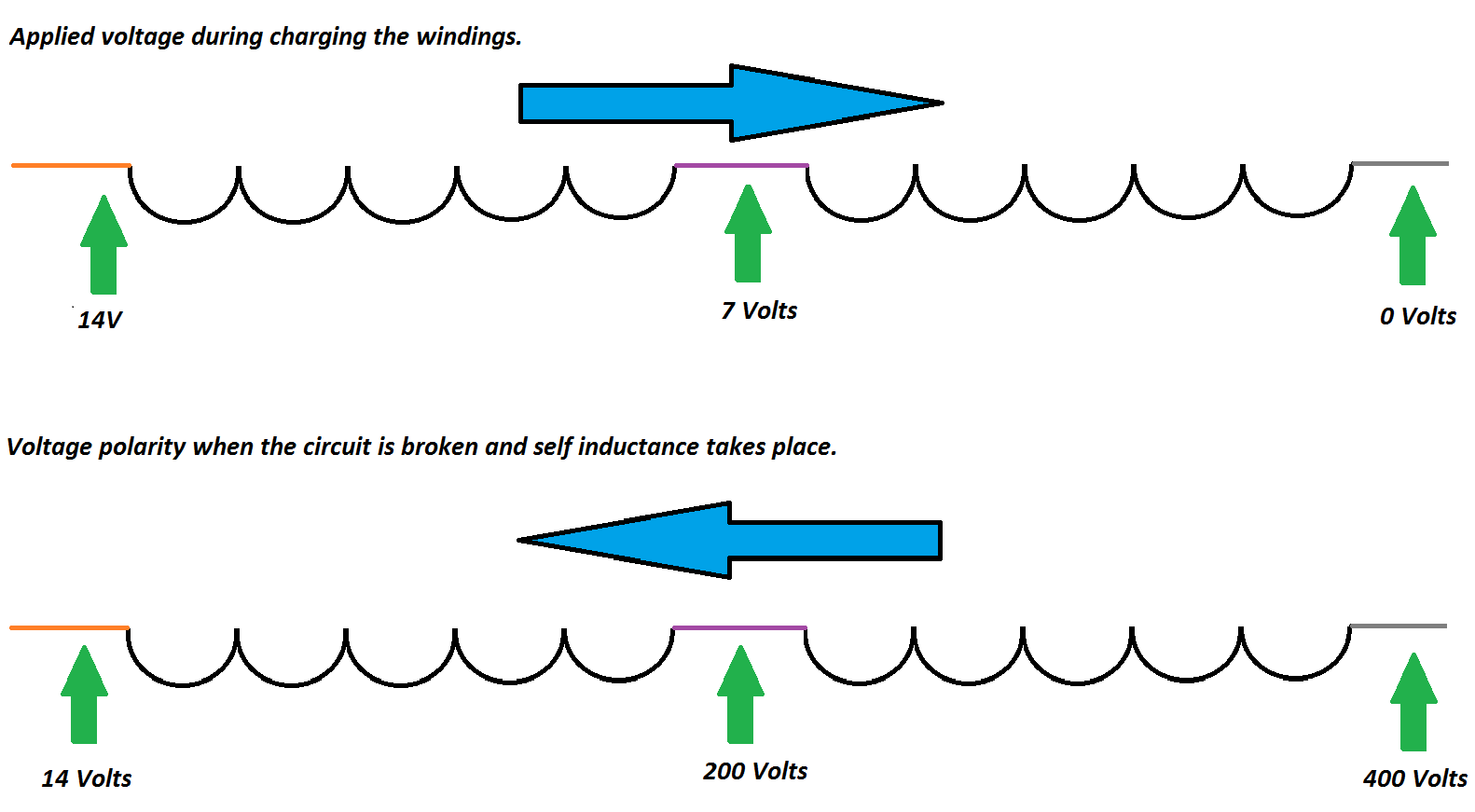 The engine control module "breaks" the circuit and current flow ceases. This results in a voltage becoming induced into the secondary winding due to mutual inductance and into the primary winding due to self-inductance. This system uses “ramp and fire”, this is where the primary ground circuit is open just before the primary winding reaches magnetic saturation. This reduces thermal stress on the coil.