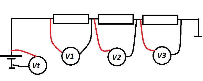 In a DC circuit, the sum of the voltage drops is equal to the applied voltage.