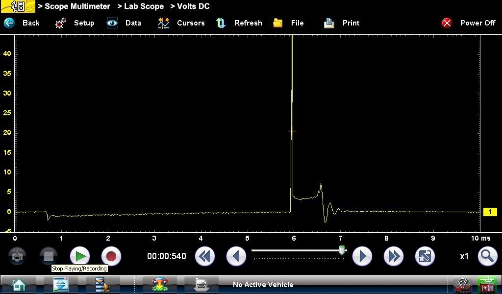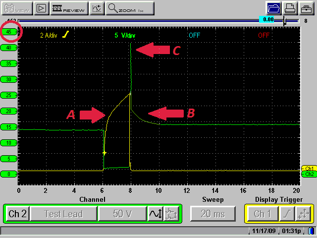 The image below was taken from a vehicle that had a shorted winding. It can be seen from point (A) that the characteristic ramp-up of current flow is missing and the current increases sharply. This short circuit has the effect of altering the turns ratio between the primary winding and the secondary winding. As can be observed from point (B) an ignition misfire is present in the secondary circuit. Another point to note is point (C), a reduction in the induced back EMF in the primary winding.