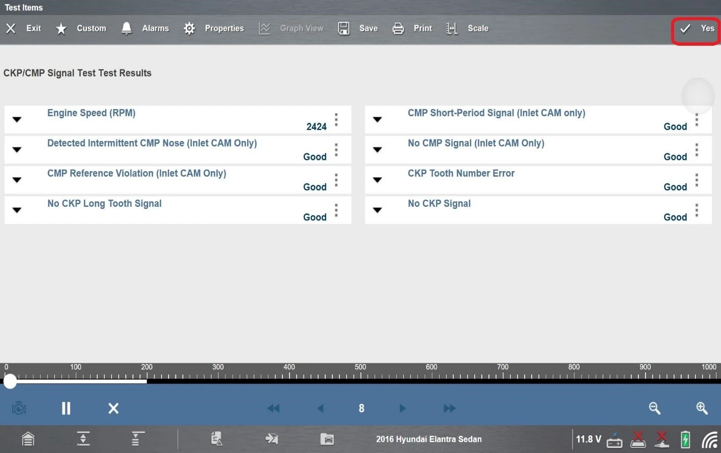 Many OEMs will display a trouble code when there is a problem with cam and crank correlation pointing toward a time chain elongation or belt stretch. Some OEMs offer specific CKP/CMP Signal tests. A great example of this is found in the Service Reset and Relearn section on select Snap-on® tools with Guided Component Tests as shown below for a Hyundai®.