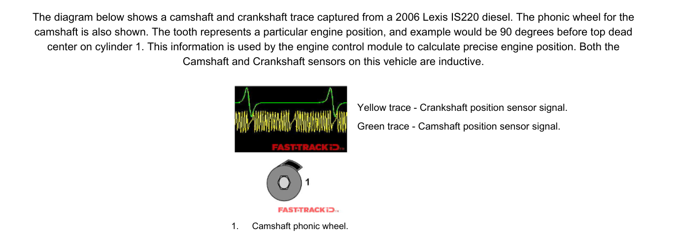 Some diagnostic tools have classes available to learn about cam and crank relationships. Here you can learn about known good values.