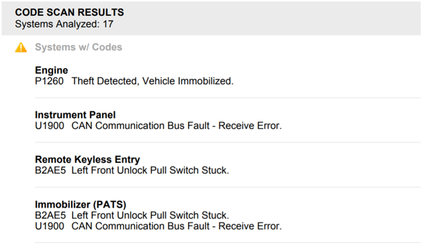 As we can replicate the no communication with pulling the passenger door handle, clearing all the previous codes and then creating a ‘no communication’ with the RKE created these codes. With the Theft Detected code appearing, this switch looks very likely to be at fault.