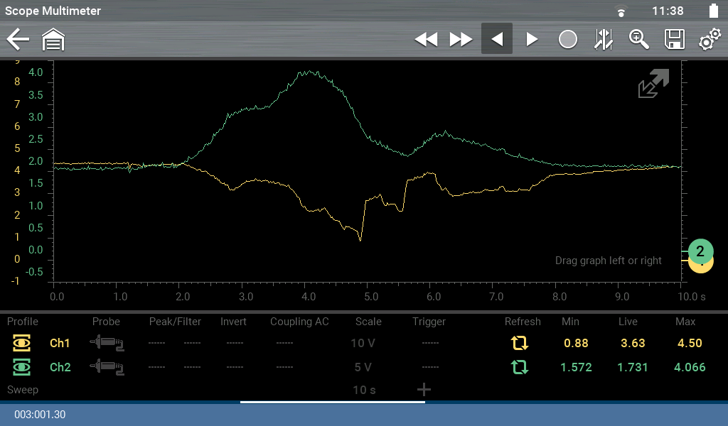 Another option to investigate the operation of a system is to use an oscilloscope. A scope provides graphical representation of voltage over a particular time duration. The waveform below shows the output from the Boost Pressure Sensor and the Feedback from the Turbocharger Vane Position Sensor under Wide Open Throttle operation on a road test.