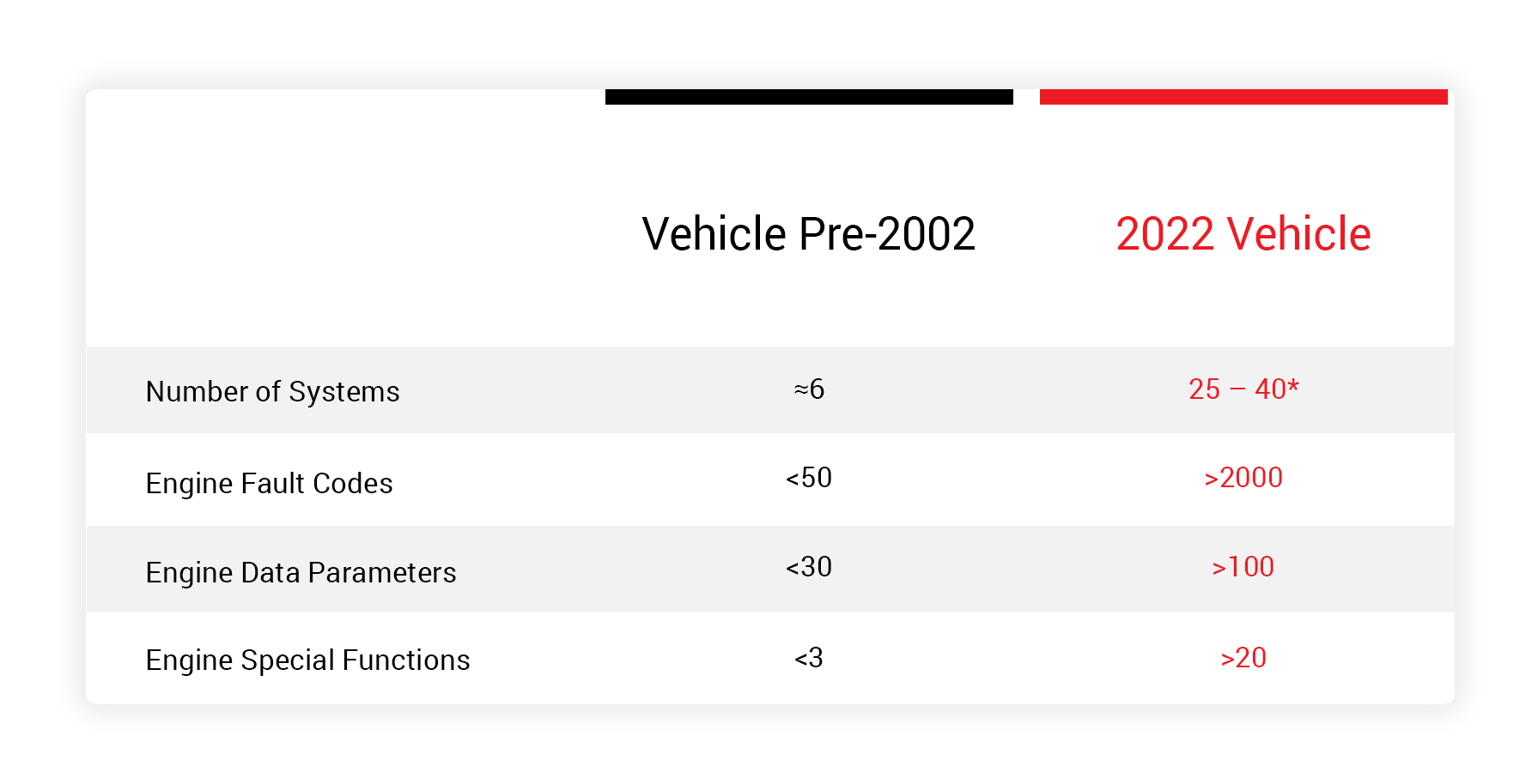 This added complexity means technicians are flooded with additional data when diagnosing vehicle faults. Below is a table outlining the difference between a modern vehicle and a vehicle from 20 years ago, this is only a high-level example to illustrate the differences: