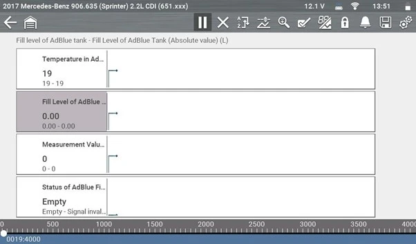Live data indicated the AdBlue tank level at 0.00 litres – completely empty.