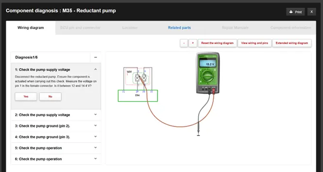 A manual pressure-gauge check at the injector supply line confirmed 0 bar. Power and ground signals were verified at the reductant pump using the Snap-on® Information System wiring diagram and integrated test plan. Despite correct voltage and ground, the pump failed to actuate, even after a light tap of ‘percussive persuasion’.