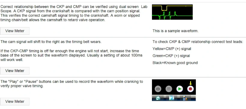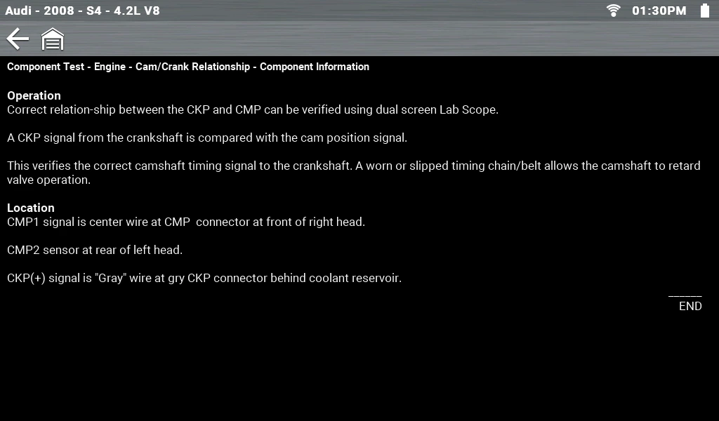 An option in Guided Component Tests is Cam/Crank Relationship. That should allow me to check everything I need to. The Component Information teaches how these sensors should work together and operate. It also shows where they are located.