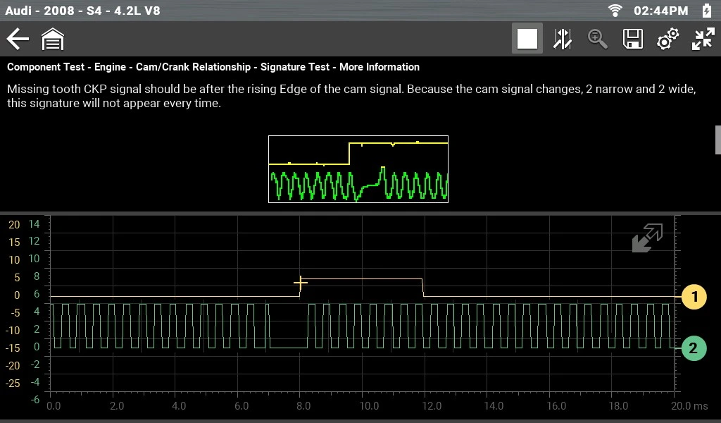 The lower window is the live test of this Audi. The traces do NOT line up by quite a bit. This indicates retarded engine timing. The only thing that could really cause that is the timing chain elongation. That will accouint for both the DTC and the complaint of poor acceleration.