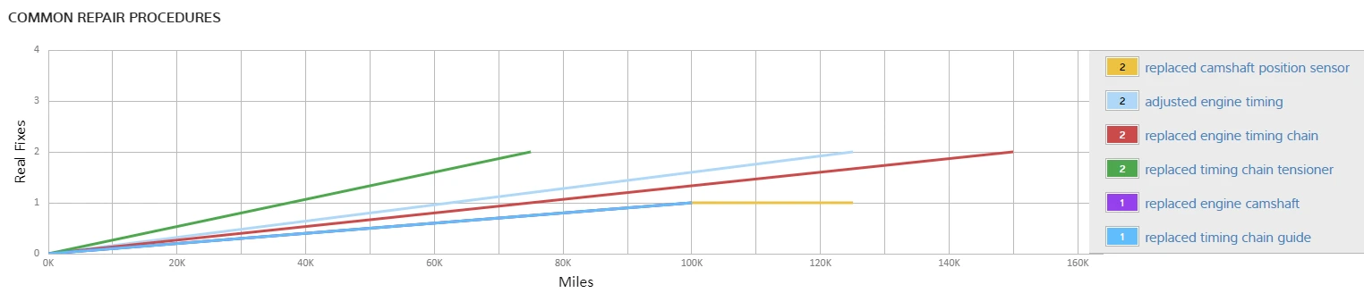 According to SureTrack, the most common repairs have to do with the Camshaft position sensor or engine timing/timing chain components. Note the mileage that the timing chain becomes a common issue is around the milage of this case study. 140K or so.
