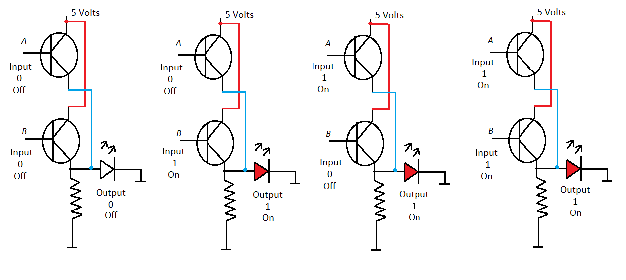 This circuit uses two transistors which are connected in parallel, both collectors have an independent 5 volt supply and both emitters can allow current to flow to ground separately. Again a light emitting diode is used as a visual reference. A voltage is measured at the output point when any one or both transistors are switched on. Again note the output is connected upstream of the resistor.