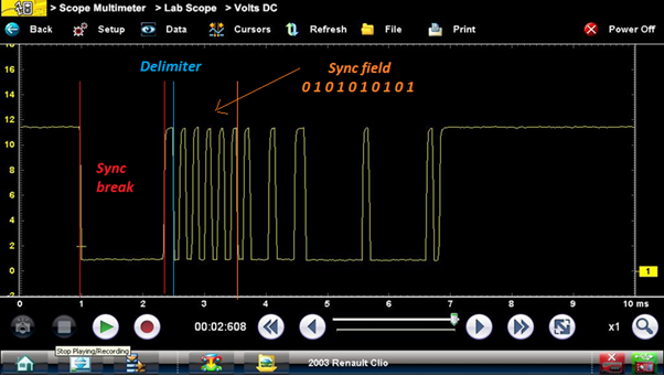 LIN Bus has an idle voltage of approximately battery voltage. During communication the module pulls the Bus voltage towards ground potential, this is a dominant (1) bit. To ensure correct message timing the master LIN node synchronises the other modules on the network with a 10 bit Synchronisation field.