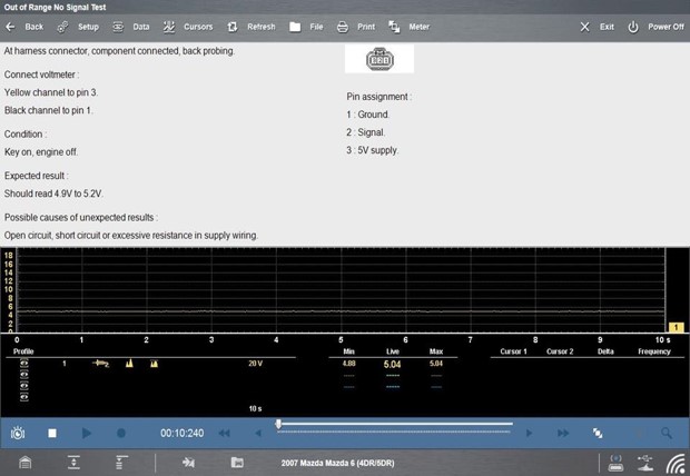 Using guided component tests on the signal wire we see 0V, yet we should expect to see at least 1V.