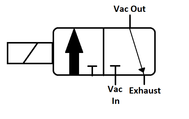 The solenoid valve used to control the turbocharger is a three way, normally closed valve. There are three ports, although only two may be easily identifiable. There will be a supply (Vac-In) from the vacuum pump, output to the turbocharger (Vac-Out) and an exhaust, which can sometimes be connected to the intake air filter housing. The purpose of the exhaust is to bleed atmospheric air pressure into the vacuum circuit to open the wastegate and control the boost pressure.