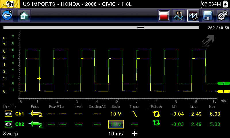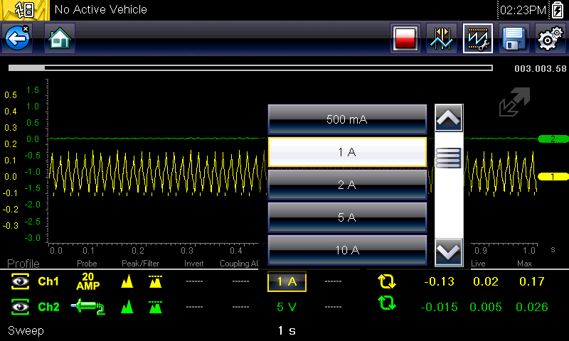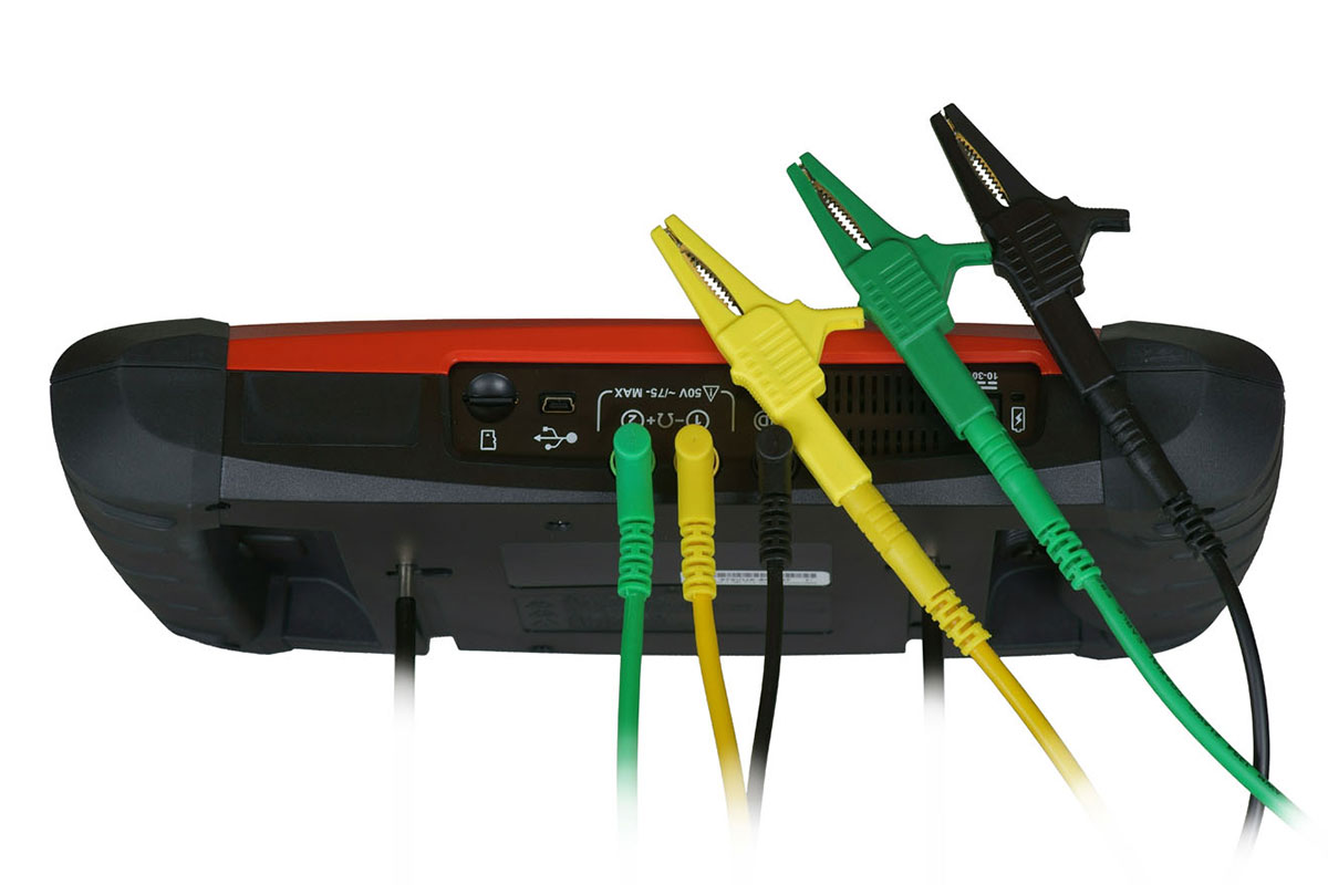 Bandwidth3MHz; Sweep rate as fast as 50 microsecondsDimensions (WxDxH, in)12.5 x 2 x 6.5Display resolution800px x 480pxLab Scope / MeterHigh-speed 2-channel lab scope displays up to two waveforms in real timeSample Rate: Up to 6 million samples/secScale range 0-100mV to 0-400VSweep rate 1 second to 5 minutesUSB PortPC connectivity