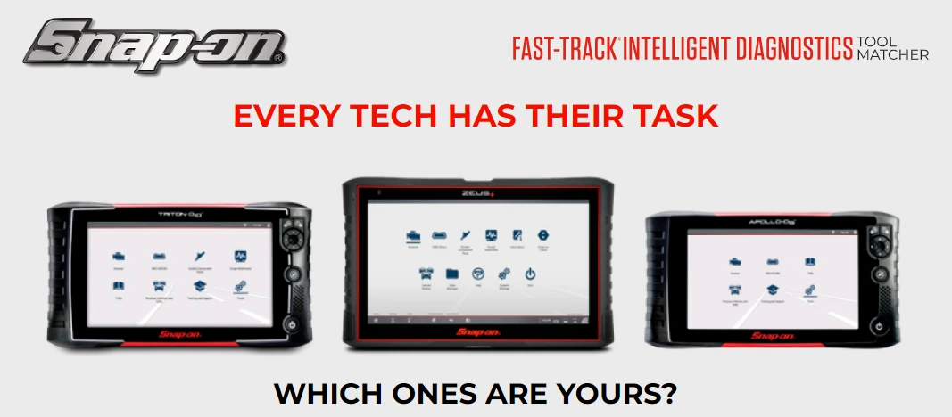 The products featured in Tool Matcher are our current Snap-on ZEUS+™, TRITON-D10™, APOLLO-D9™ and SOLUS+™ scanners.