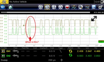 The waveform below shows both the signal when CAN High and CAN Low are tested with respect to ground and the differential voltage between CAN High and Can Low. Example shown from a Volvo XC-90.