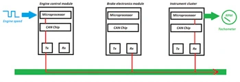 The diagram below illustrates how a message received by the engine control module is processed and transmitted on the network for other modules. In this example the engine speed input from the crankshaft position sensor to the engine ECM is also required by the Instrument cluster for the tachometer.