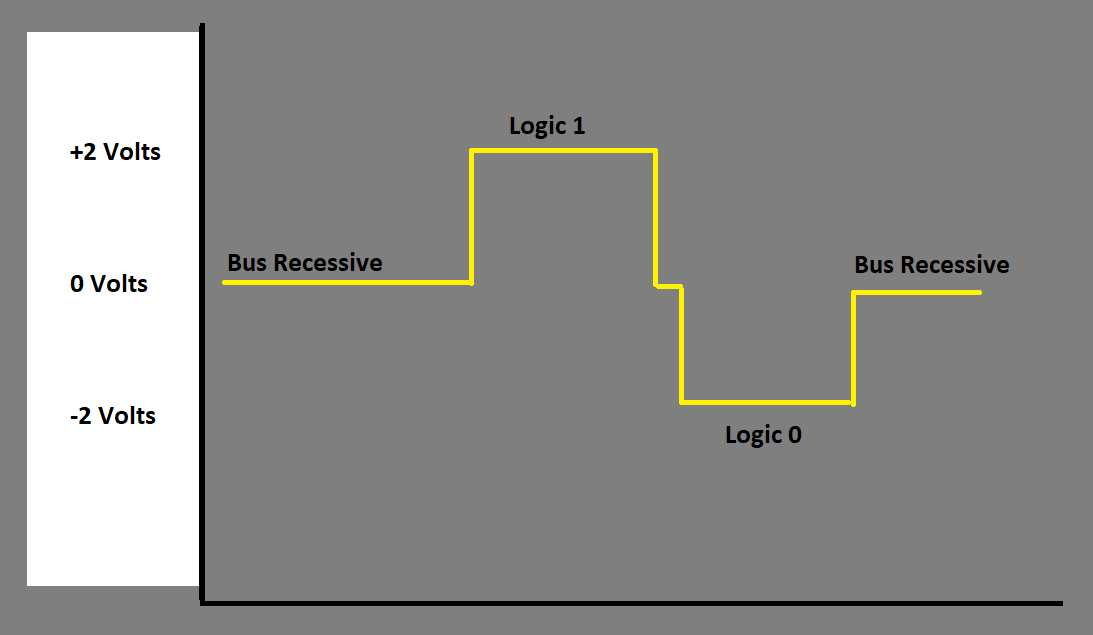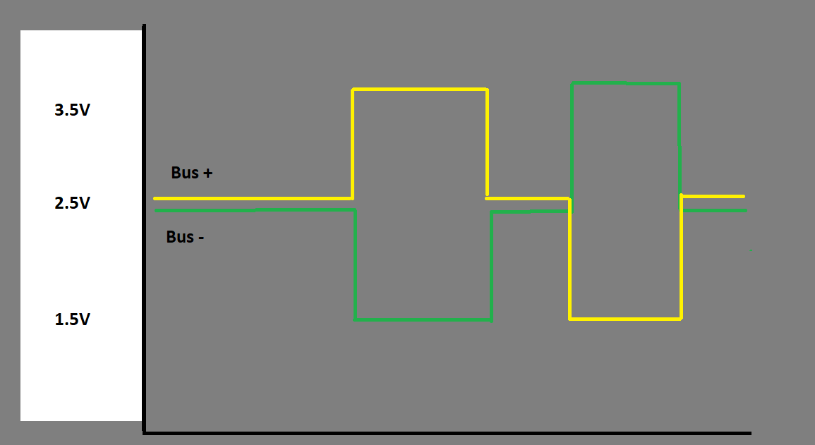 When a logic bit of 0 is required the Bus (+) voltage reduces to 1.9 volts and the Bus (-) voltage increases to 3.1 volts. This creates a differential voltage of -1.2 volts.