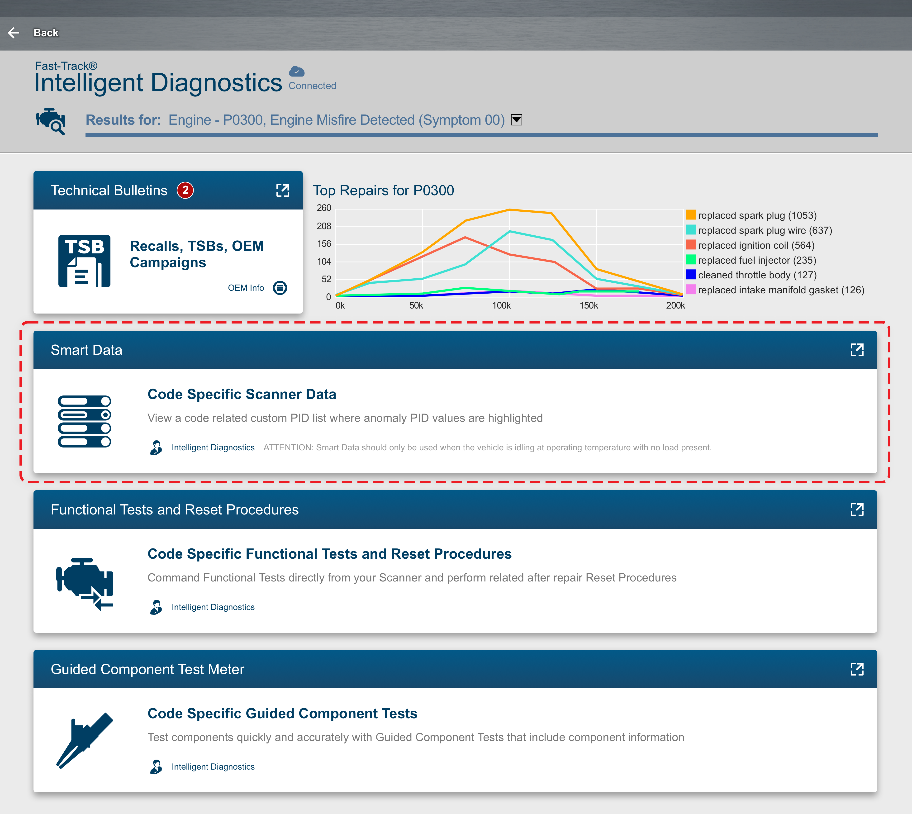 Smart Data is a technology exclusive to Snap-on® diagnostic scan tools equipped with the latest software that can save you time on every diagnostic code. As one of the most powerful features of Fast-Track® Intelligent Diagnostics, Smart Data automatically filters and prioritizes the most relevant data parameters related to the specific trouble code detected—eliminating guesswork or the need to manually sift through hundreds of data parameters.