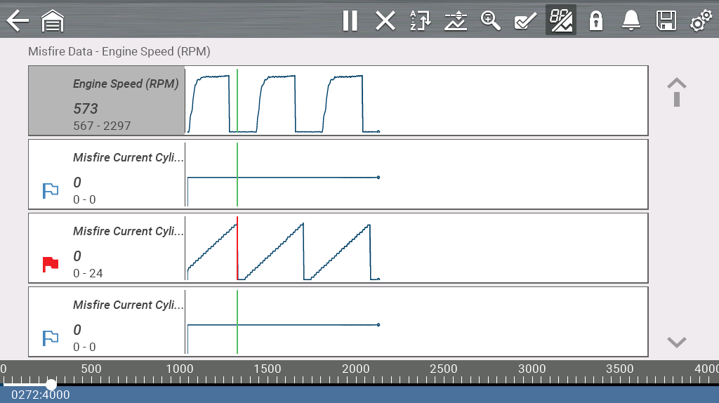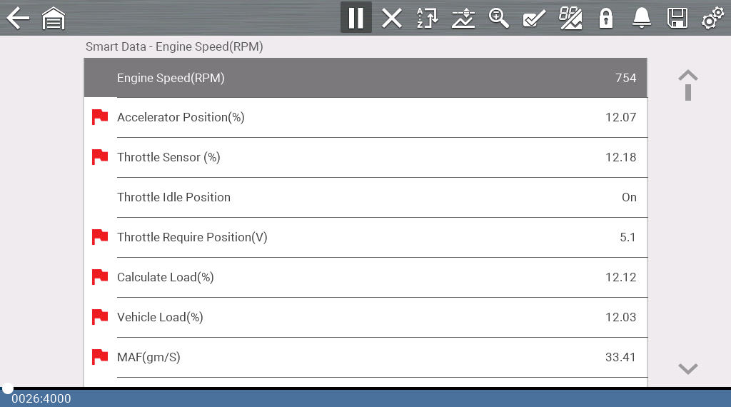 When selecting the Smart Data icon on the Fast-Track® ID landing page, the software automatically displays a custom PID list with only the data parameters related to the selected trouble code on this vehicle, and it flags which ones are out of range, at idle – red flags indicate parameters that are currently out of range, while blue flags highlight parameters that were previously out of range.