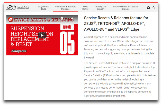 One of the new time-saving and productivity-enhancing features included in the fall Snap-on® diagnostic software release is the Service Resets & Relearns feature for ZEUS®, TRITON-D8®, APOLLO-D9™, APOLLO-D8™ and VERUS® Edge. This Snap-on exclusive offers a smart approach to a quicker and more comprehensive solution to complete a repair by providing procedures like functional tests, resets and relearns related to the service selected.