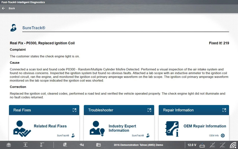 What is the root cause of the problem? With SureTrack® you’ll see which repair procedures are most frequently performed to successfully complete the repair on vehicles just like the one in your bay. Quickly determine the most likely fix based on vehicle-specific model, mileage, codes, components and symptoms.