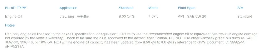 Therefore, oil change interval is critical to timing chain longevity. What about the type of oil? Does that matter? Below are oil type specifications from quick look ups, for the exact year, make and model vehicle. The only difference is the engine size. Note the different fluid spec for each. Could that be a common mistake? Would chain elongation be the result? Absolutely.