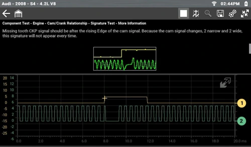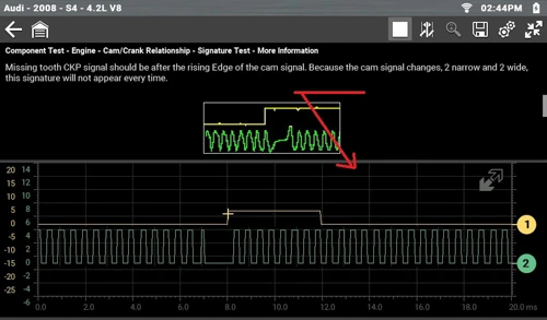 The lower window is the live test of this Audi™. The traces do not line up by quite a bit. This indicates retarded engine timing. The only thing that could really cause that is the timing chain elongation. That will accouint for both the DTC and the complaint of poor acceleration.