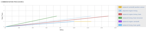 According to SureTrack®, the most common repairs have to do with Camshaft position sensor or engine timing/timing chain components. Note the milage that the timing chain becomes a common issue is around the milage of this case study, 140K or so.