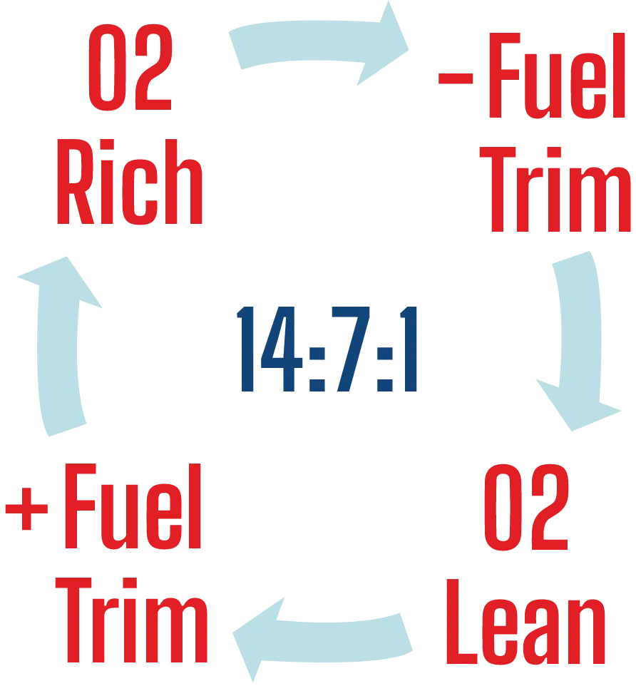 Fuel trim is the adjustment the PCM makes to maintain a balanced A/F ratio. If the O2S reads rich, the PCM reduces fuel to lean it out. The fuel trim reading on the scan tool will show a negative number to represent subtracting fuel. If the O2S reads lean, the PCM adds fuel to richen the ratio. The fuel trim reading will have a plus sign to represent adding fuel.