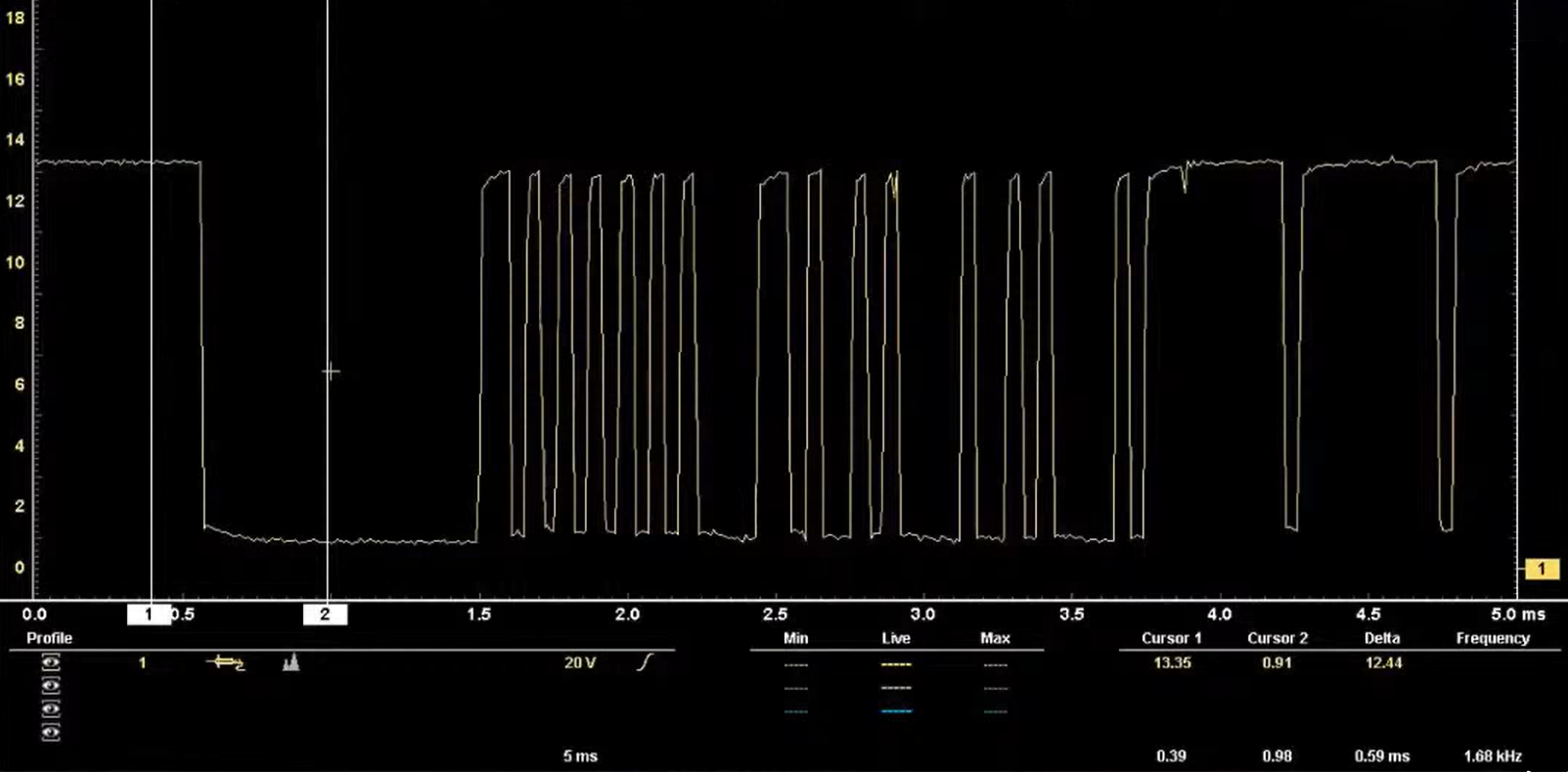 Waveforms demonstrate that the two PWM lines mirror each other throughout each packet. For example, the high side of packet 1 reads 4.53 V while the low side drops to 0.55 V; packet 2 ranges from 5.04 V down to 0.22 V. This mirroring confirms the bus is switching correctly, showing the network is active and not shorted.