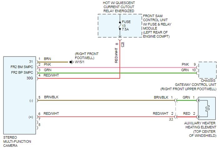 The multifunction camera is located on the windshield of this vehicle. Because this vehicle was in a collision, our thought is that the most likely causes would either be a camera left unplugged after a windshield replacement, a blown fuse that could have been shared with other components, or wiring that could have been damaged in the accident. After checking to make sure the camera was plugged in, we accessed the front SAM (Signal Acquisition Module) and verified that there was power on both sides of fuse 13.