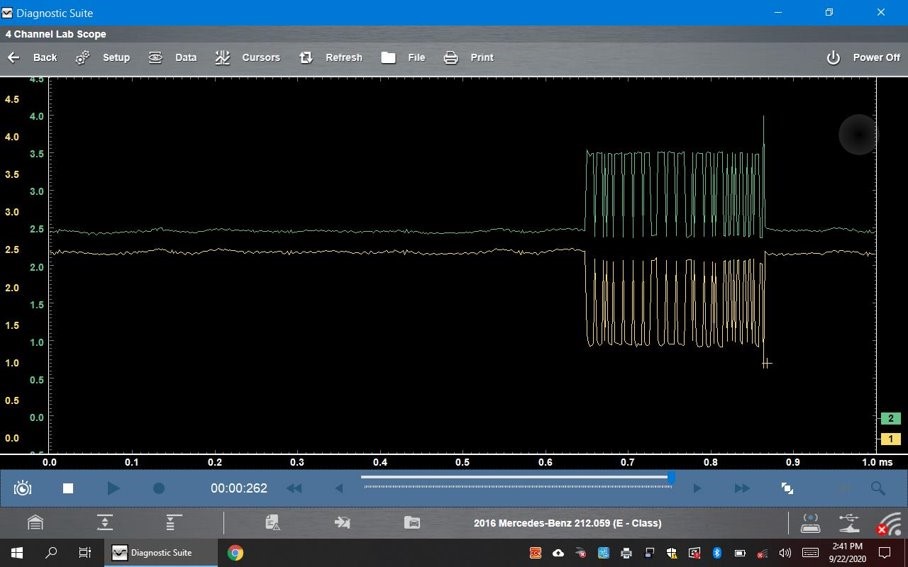 We use the camera’s ground and connect one scope lead to each CAN circuit and dial in the waveform.
