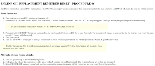 In today’s world, a reset is required to put the reminder back to zero – fresh oil change. How? That depends entirely on the OEM. Some have a manual reset procedure as seen below from Snap-on scan tool's - Oil Specs and Resets.