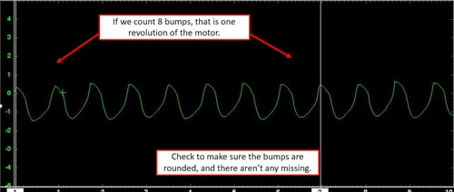 Most automotive fuel pumps have eight commutators in the motor. Each bump in graph below represents a commutator. If we count eight bumps, that’s one revolution of the motor.