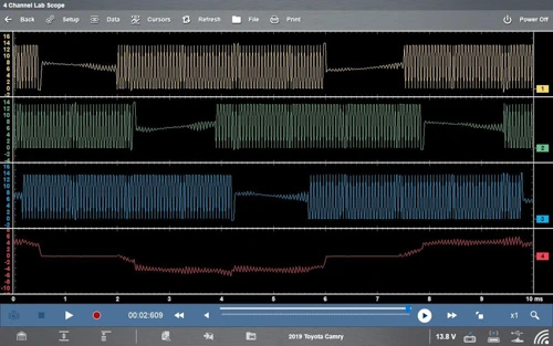 There are three circuits coming from the control module above: FPV, FPU, FPW. They send an alternate pulse voltage to their respective set of coils. This can be seen in the three traces of the lab scope below.